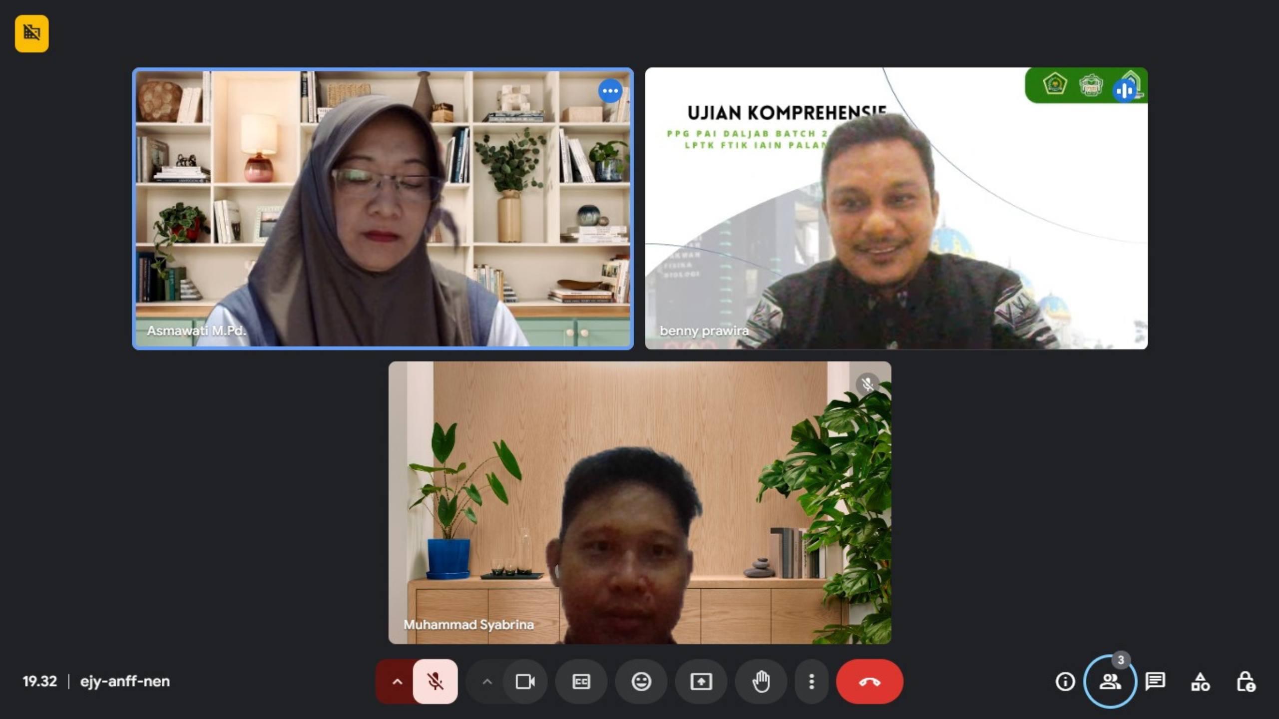 Program Studi Pendidikan Profesi Guru (PPG) melaksanakan kegiatan Ujian Komprehensif secara daring dari tanggal 4 – 7 Januari 2025. Kegiatan ini berlangsung selama tiga hari dengan sistem pembagian waktu ujian 30 menit untuk setiap mahasiswa. Dalam pelaksanaannya, praktik dan ujian mahasiswa dinilai langsung oleh dua dosen penguji, yakni Dosen Penguji 1 dan Dosen Penguji 2, yang telah dijadwalkan serta ditetapkan oleh LPTK penyelenggara PPG. Selain presentasi, mahasiswa juga diuji kemampuan membaca dan menulis Al-Qur’an, yang menjadi aspek penting sekaligus kompetensi utama bagi calon guru Pendidikan Agama Islam.